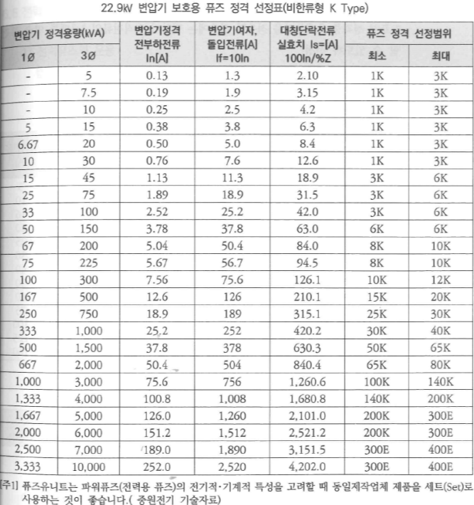 ⓖ 전력 퓨즈는 용도별로 검토가 필요하지만, 주변압기에 대한 퓨즈의 선정은 표를 참고하며, 부하의 상태나 주변압